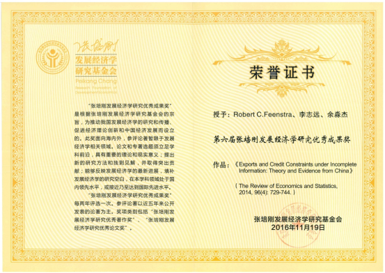 余淼杰教授于2014年10月在该杂志发表了论文“Exports And Credit Constraints Under Incomplete Information: Theory And Evidence From China”,其Google Scholar引用量为767次。该文同时获得第六届张培刚发展经济学研究优秀成果奖。
