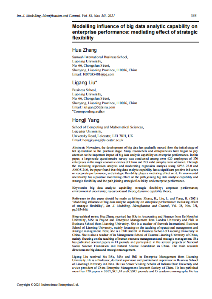新华国际商学院讲师张骅第一作者)、商学院刘力钢教授(通讯作者)、英国莱斯特大学Hongji Yang教授合作论文 Modelling influence of big data analytic capability on enterprise performance: mediating effect of strategic flexibility 在国际期刊International Journal of Modelling, Identification and Control 发表。