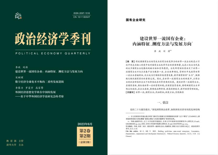 经济学院李政教授与博士生刘涛在《政治经济学季刊》2023年第2期发表封面文章《建设世界一流国有企业:内涵特征、测度方法与发展方向》。