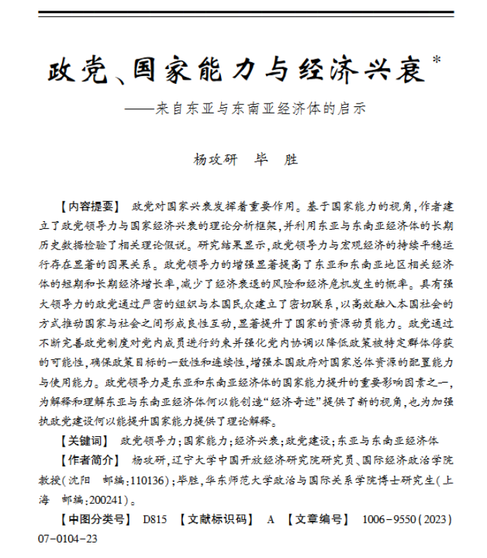 国际经济政治学院杨攻研教授(第一作者)的学术论文“政党、国家能力与经济兴衰”发表于《世界经济与政治》2023年第7期。