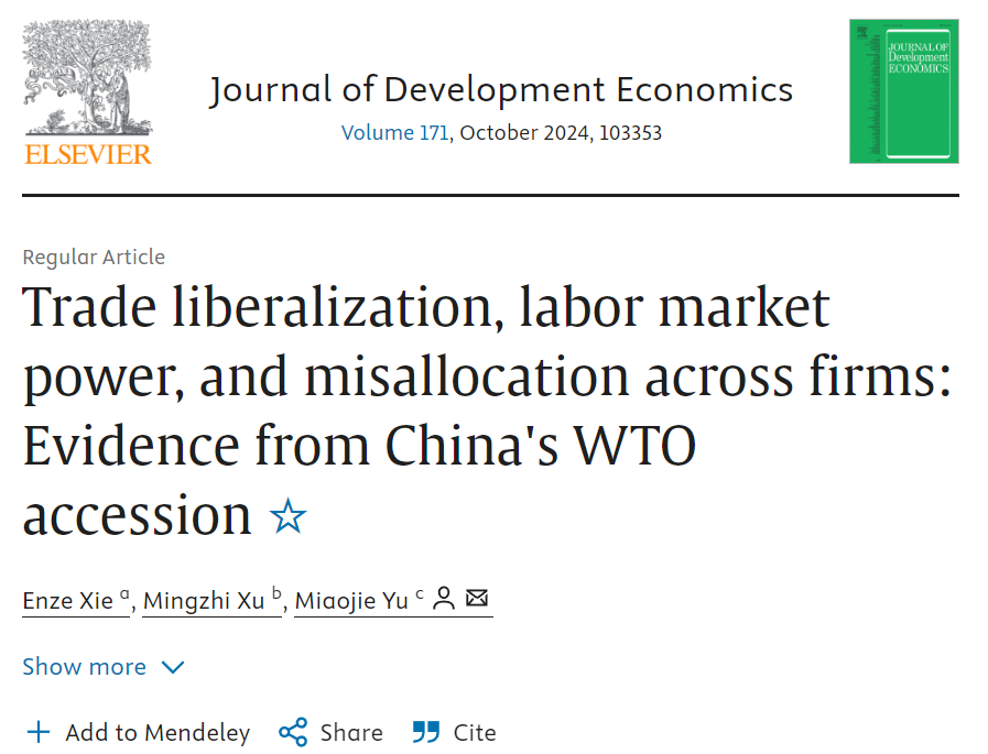 余淼杰合作论文在发展经济学顶级期刊《Journal of Development Economics》发表